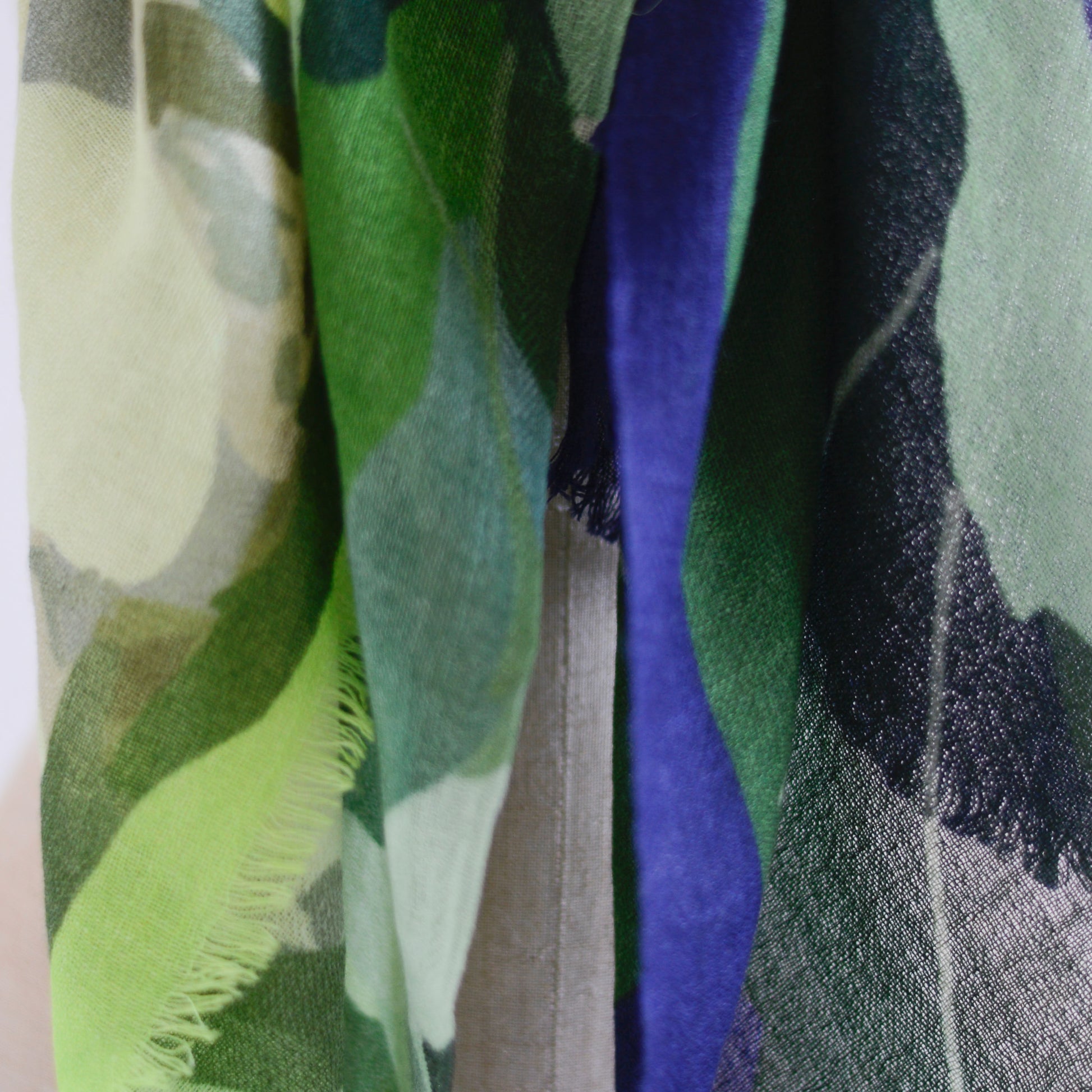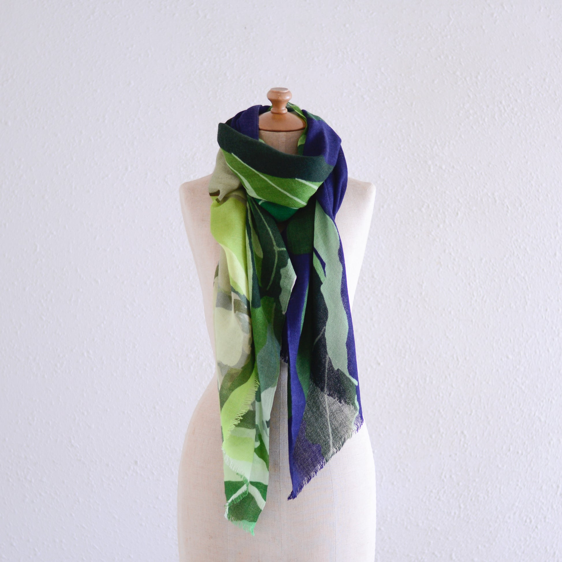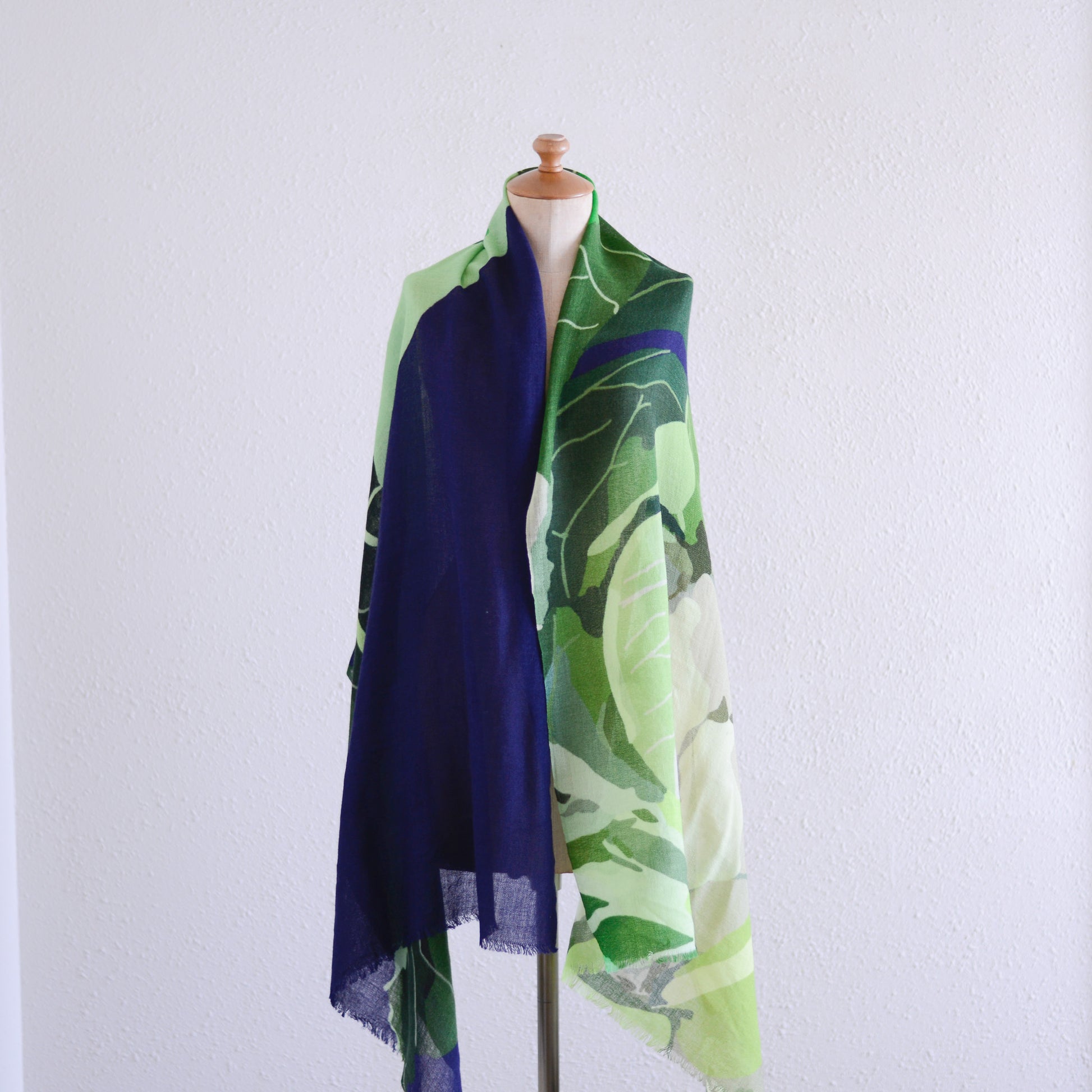 肩に掛ければ、ショールとして絵画のような存在感を放ち、首に巻けば、色のレイヤーが立体的に重なって美しいハーモニーが生まれます。