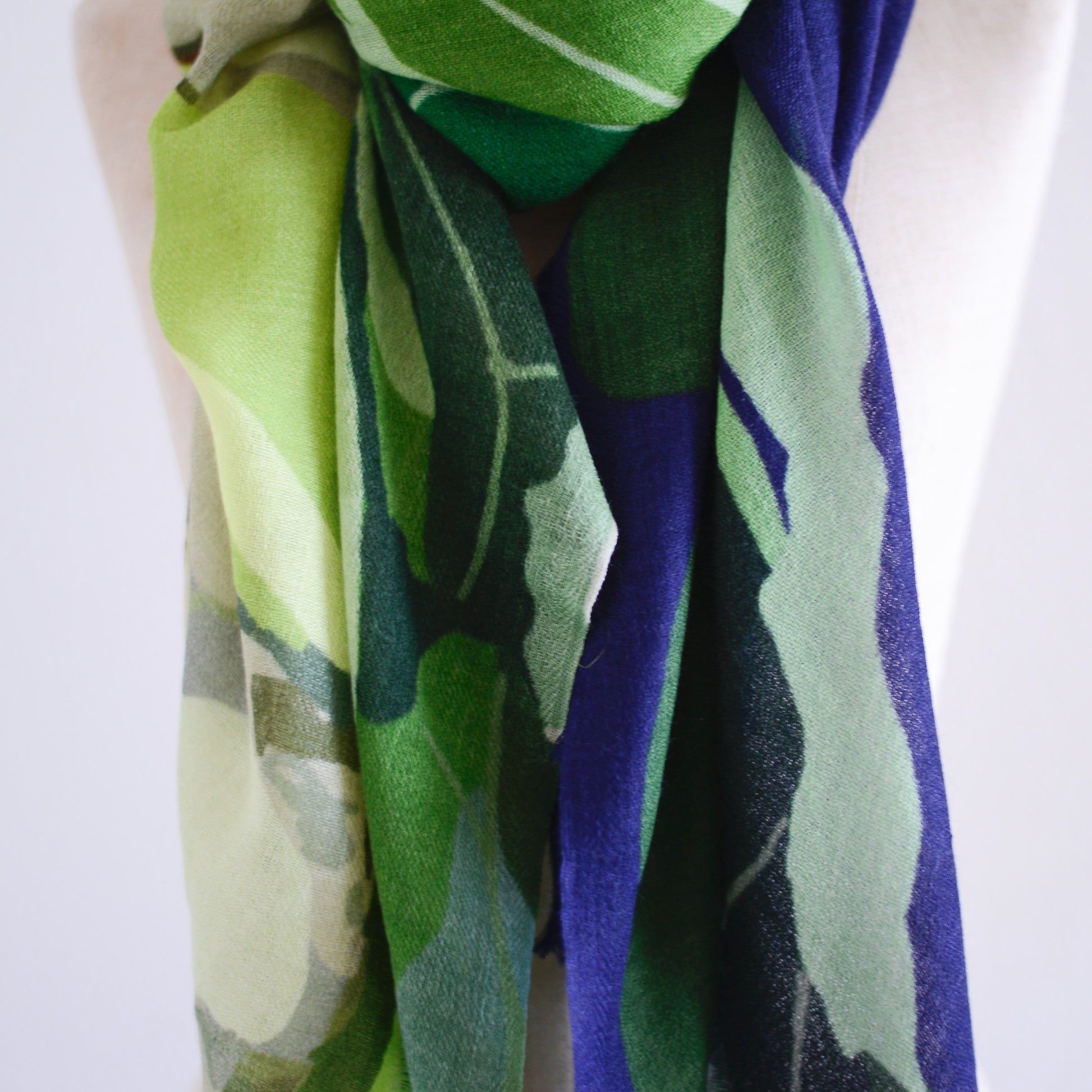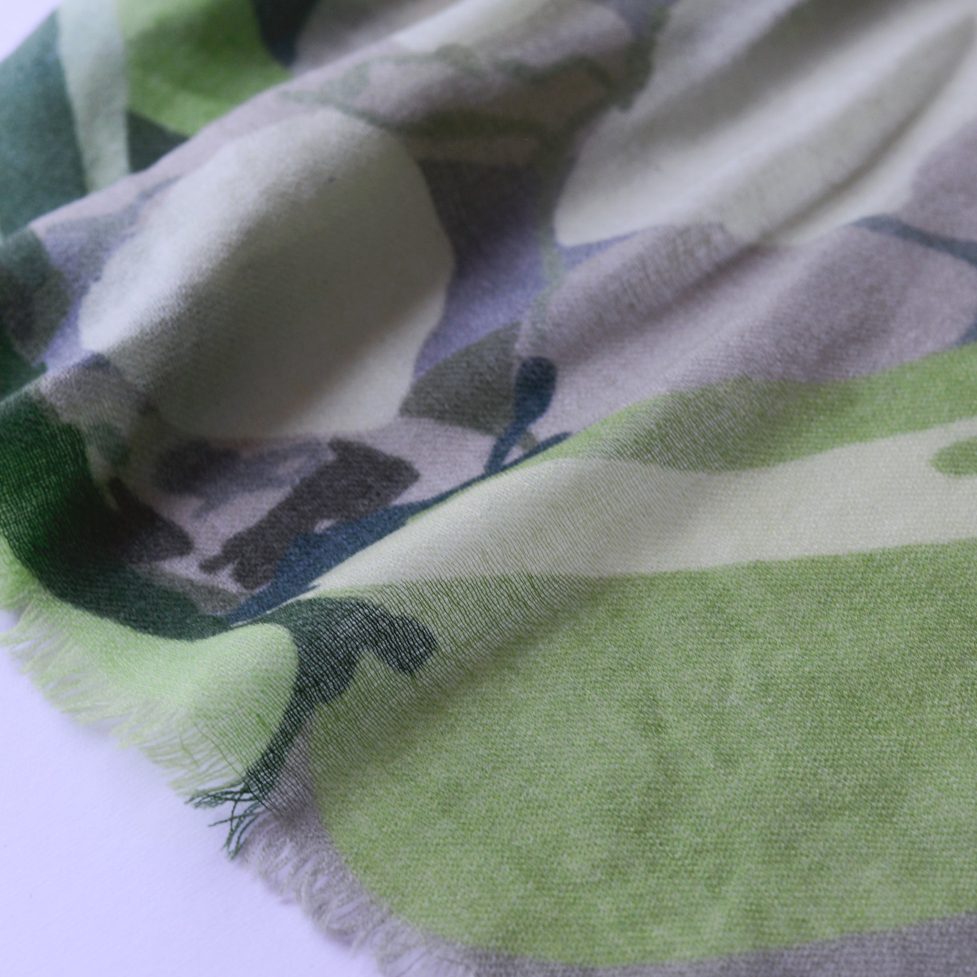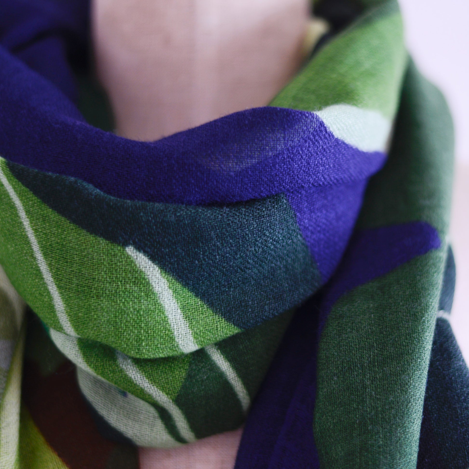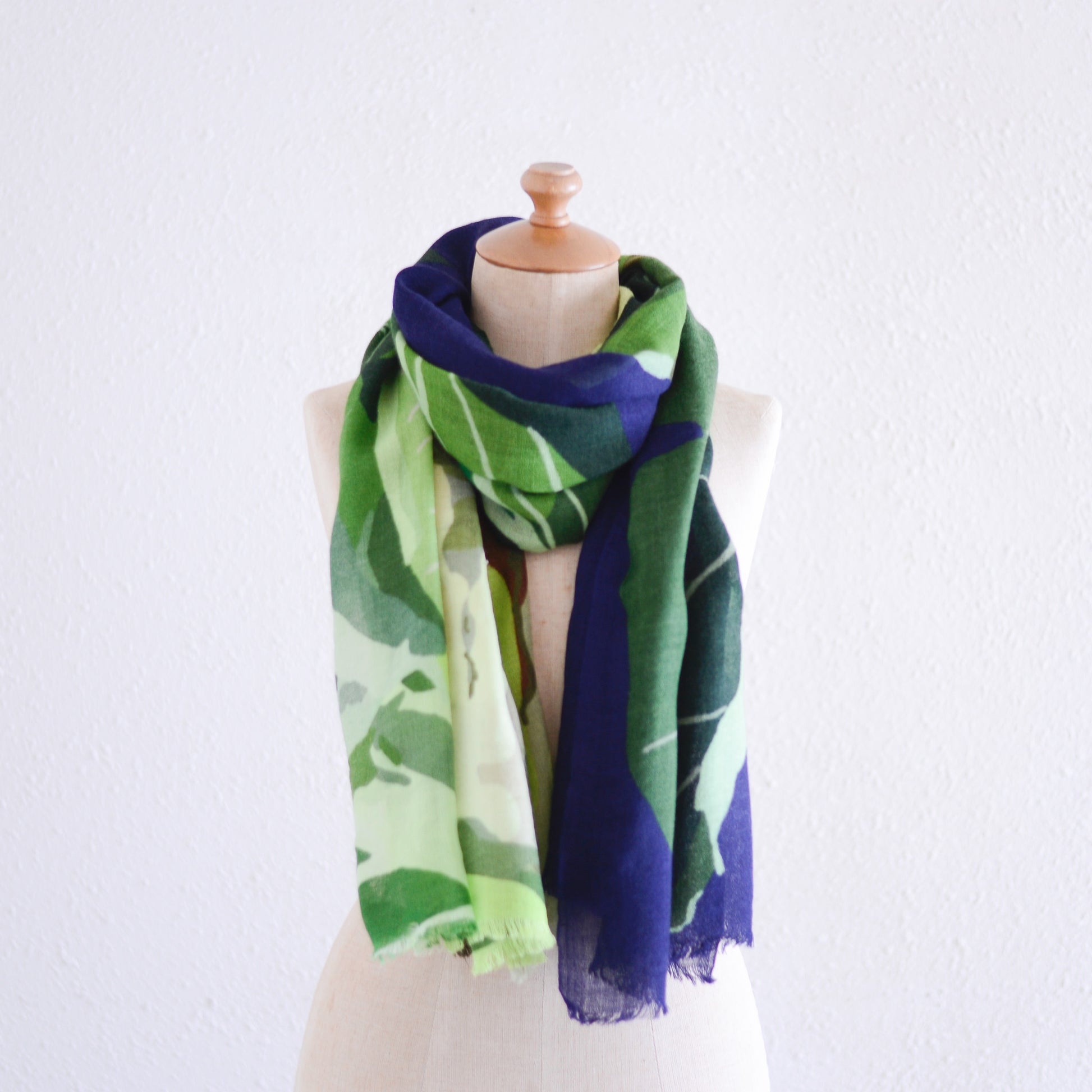 肩に掛ければ、ショールとして絵画のような存在感を放ち、首に巻けば、色のレイヤーが立体的に重なって美しいハーモニーが生まれます。