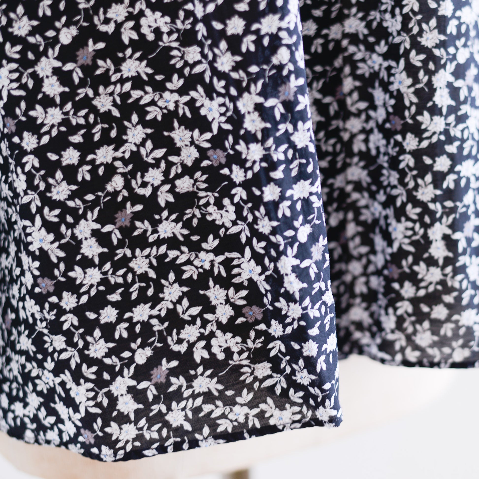 The design is a delicate print of small white flowers on a deep black background.
