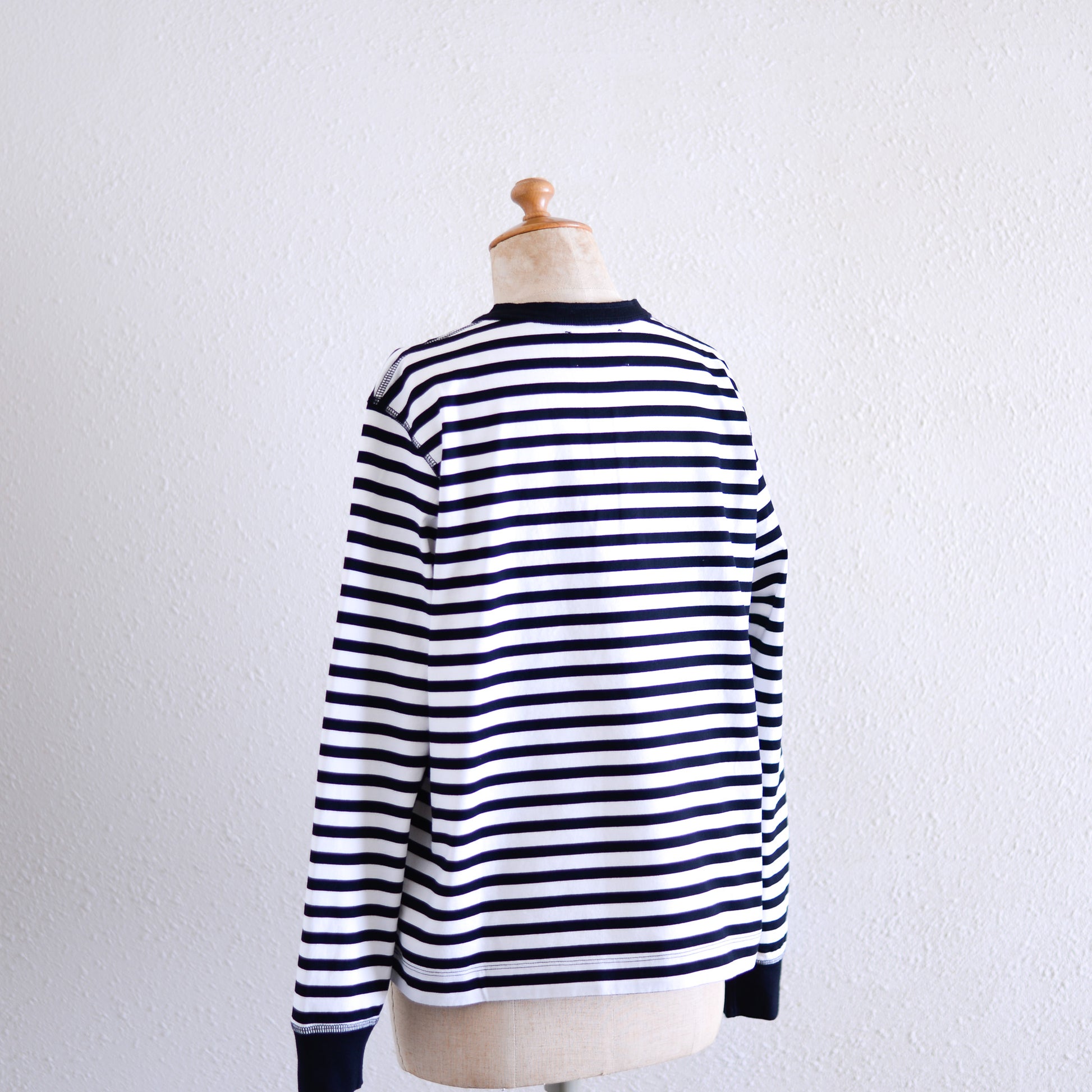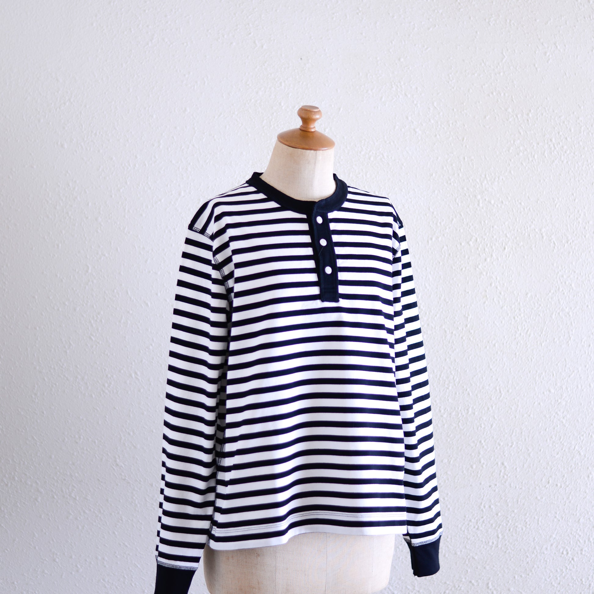 Cotton Striped Henley Neck Pullover Off White×Black