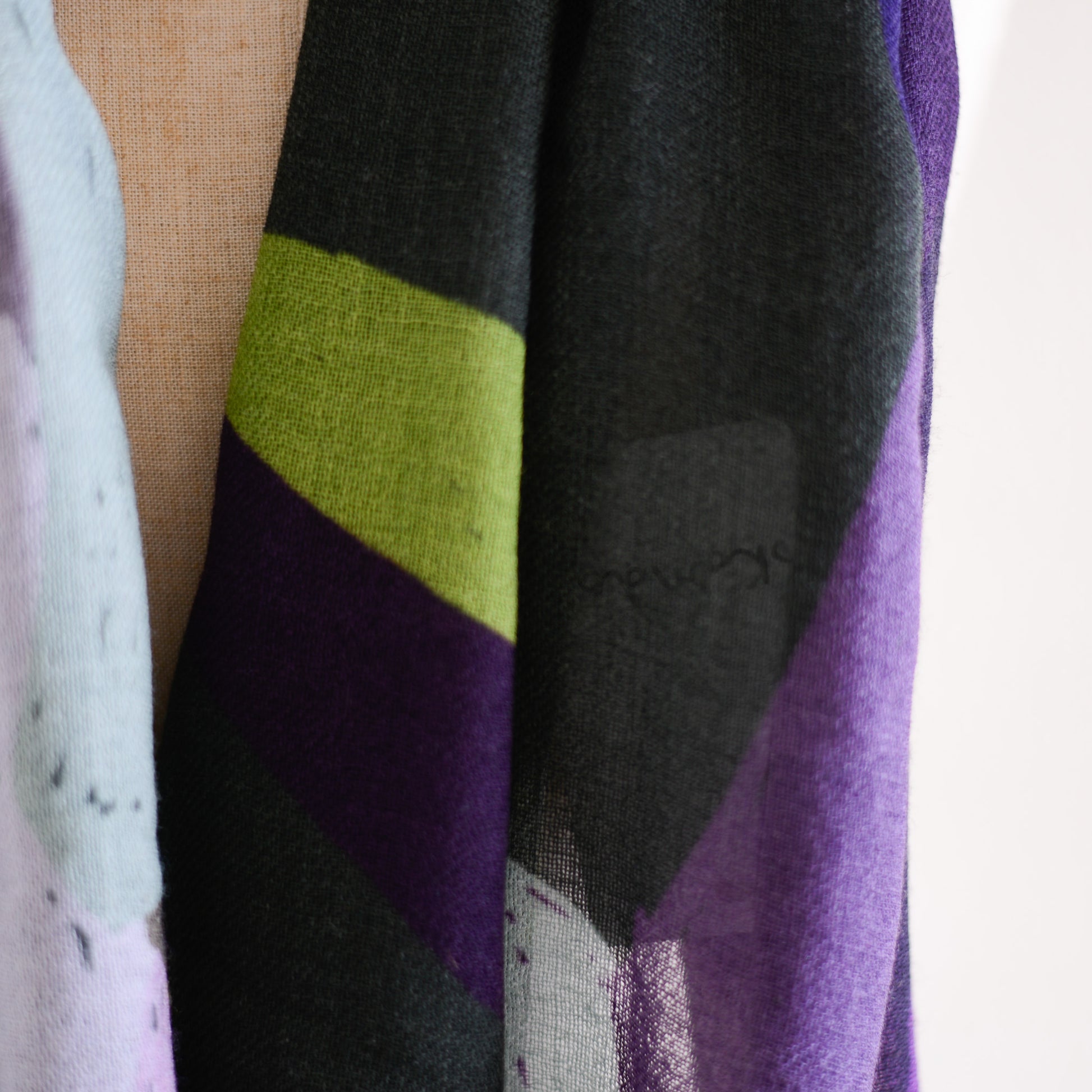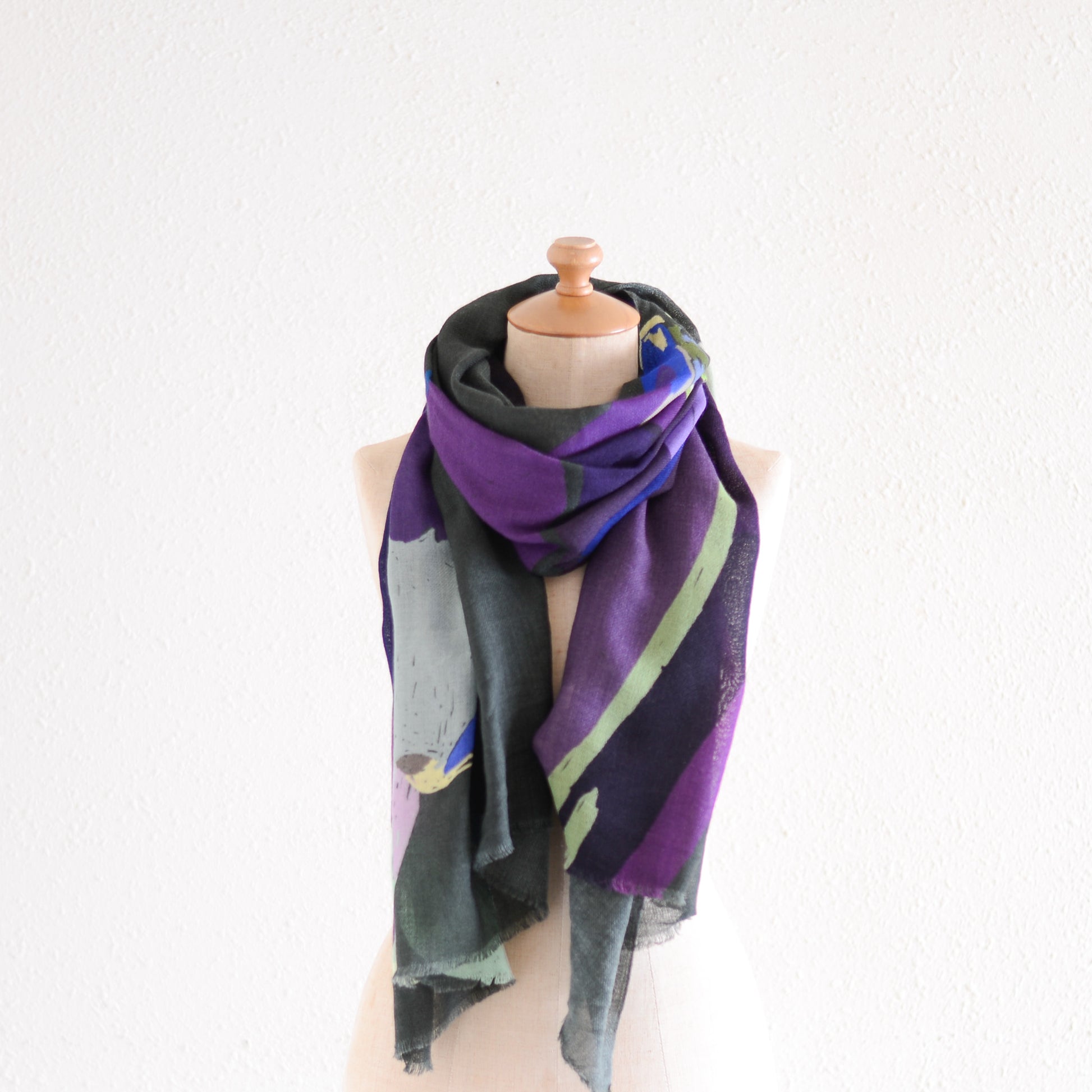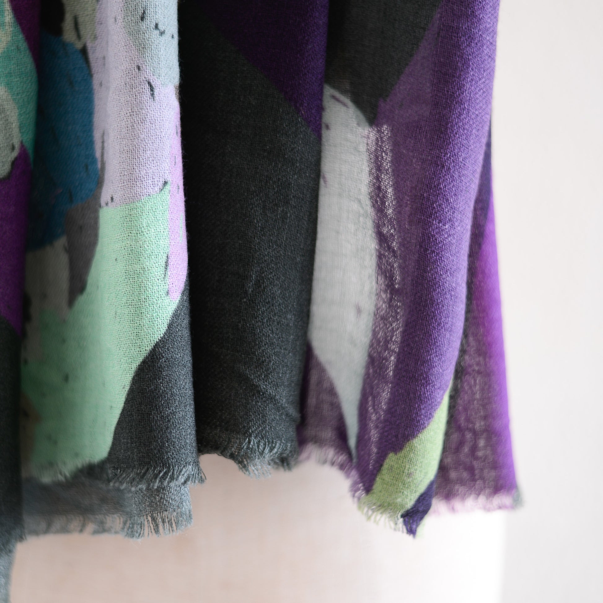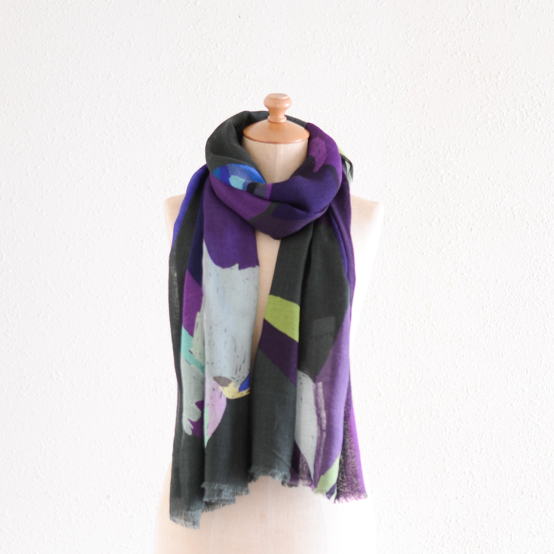 肩に掛ければ、ショールとして絵画のような存在感を放ち、首に巻けば、色のレイヤーが立体的に重なって美しいハーモニーが生まれます。