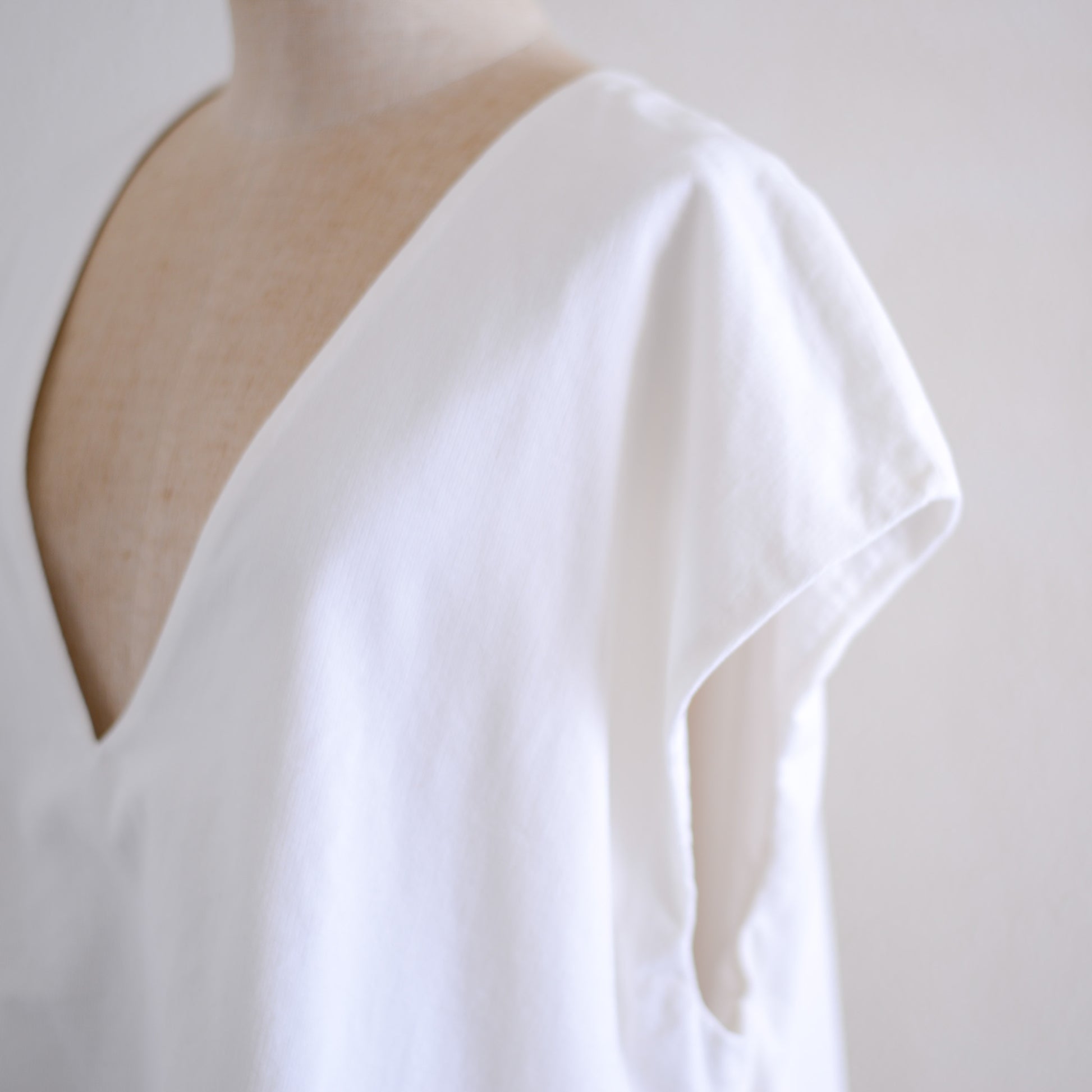 V넥을 앞으로 한다면, 원피스와의 레이어드도 추천.