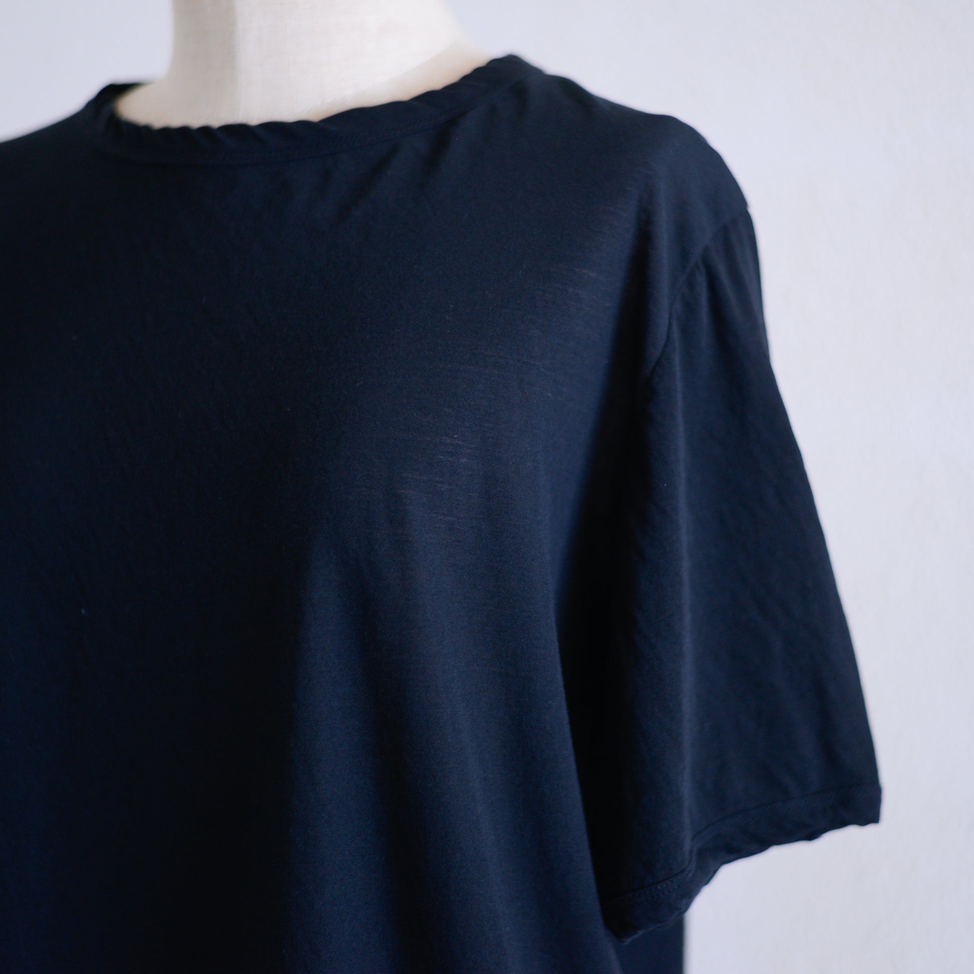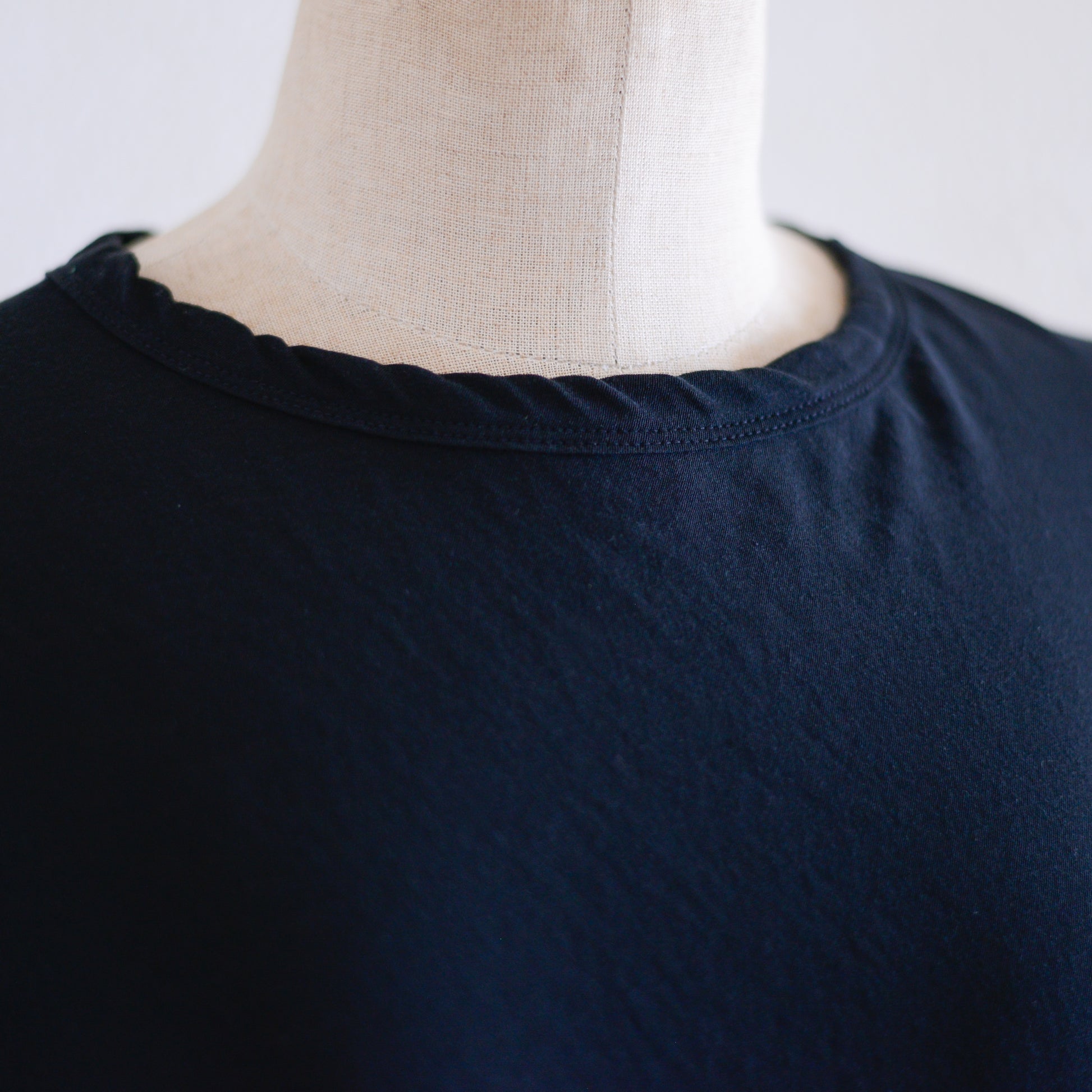 首元は鎖骨が隠れるくらいの安心感のある丸首で、Tシャツより上品、ブラウスより気軽なデザイン。