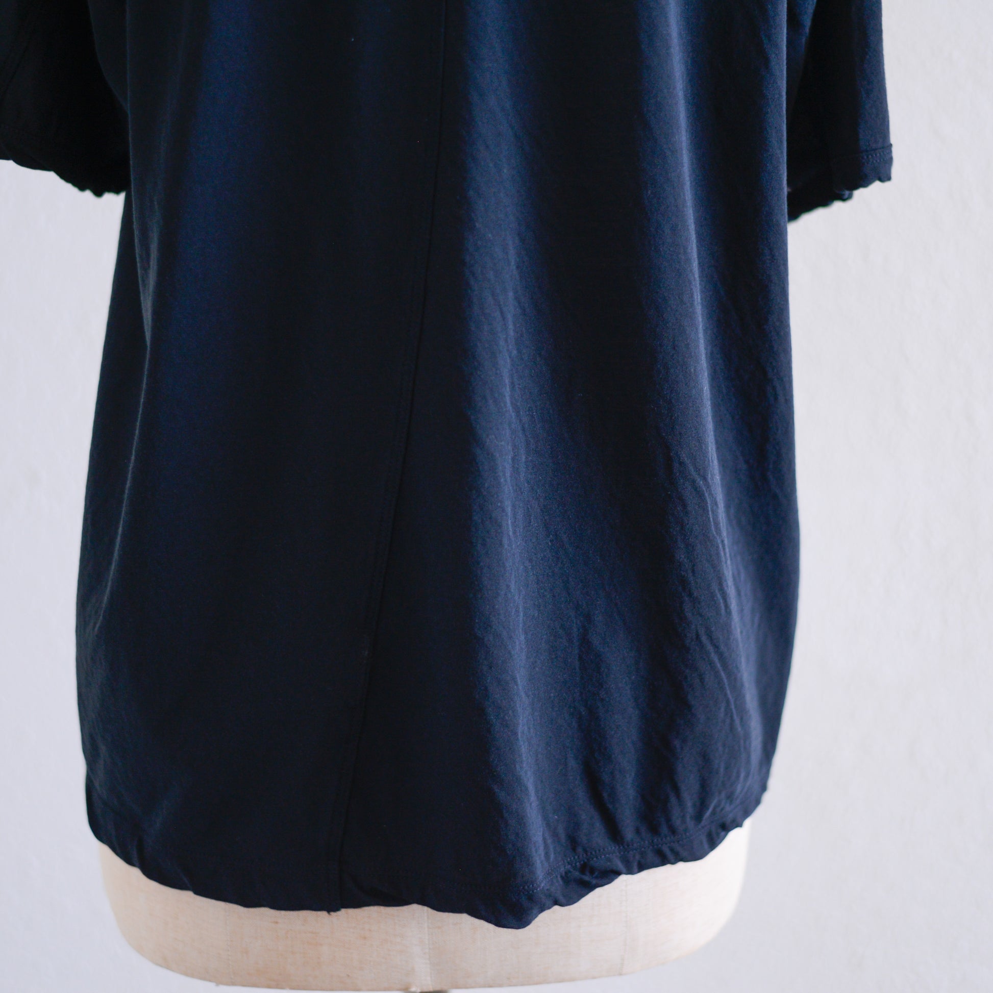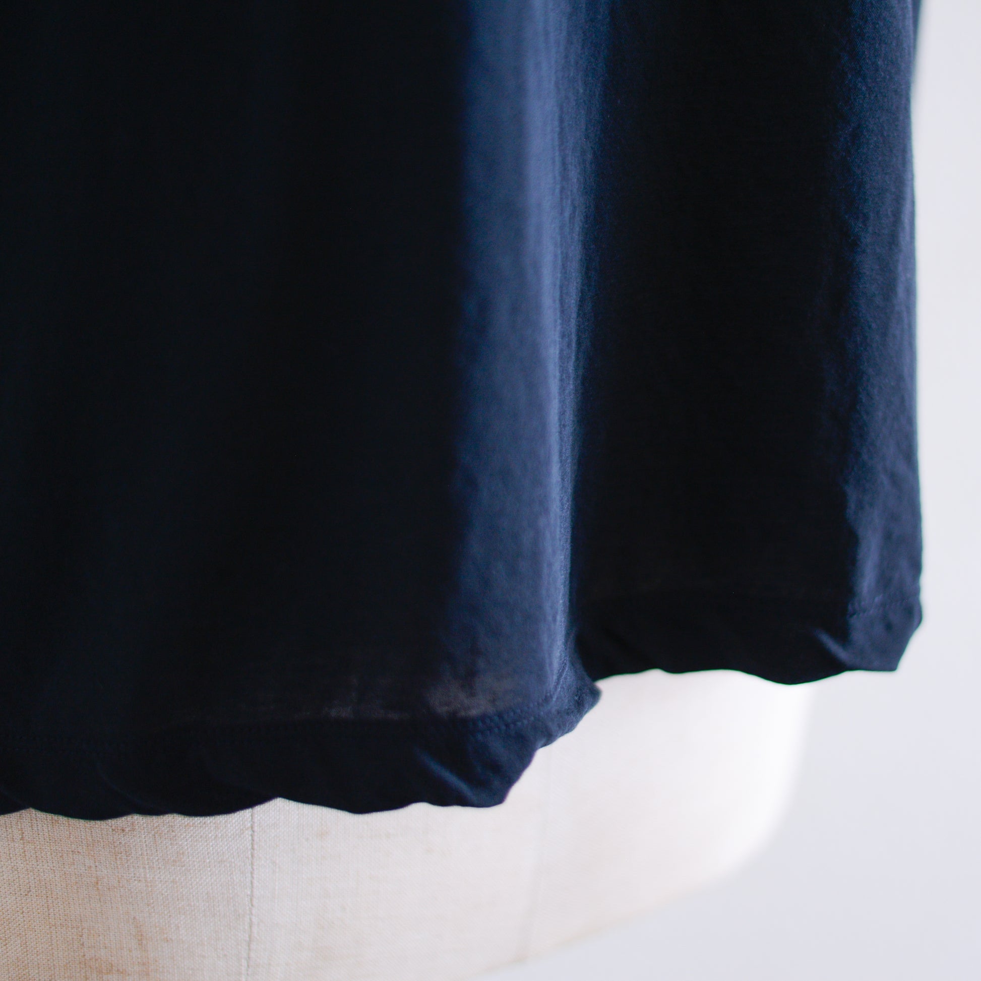 首元、袖口、袖、裾にはあえてねじれを加えており、生地全体のねじれやすさを逆手に取ったディテールが、日常の装いに小さな遊び心を添えてくれます。