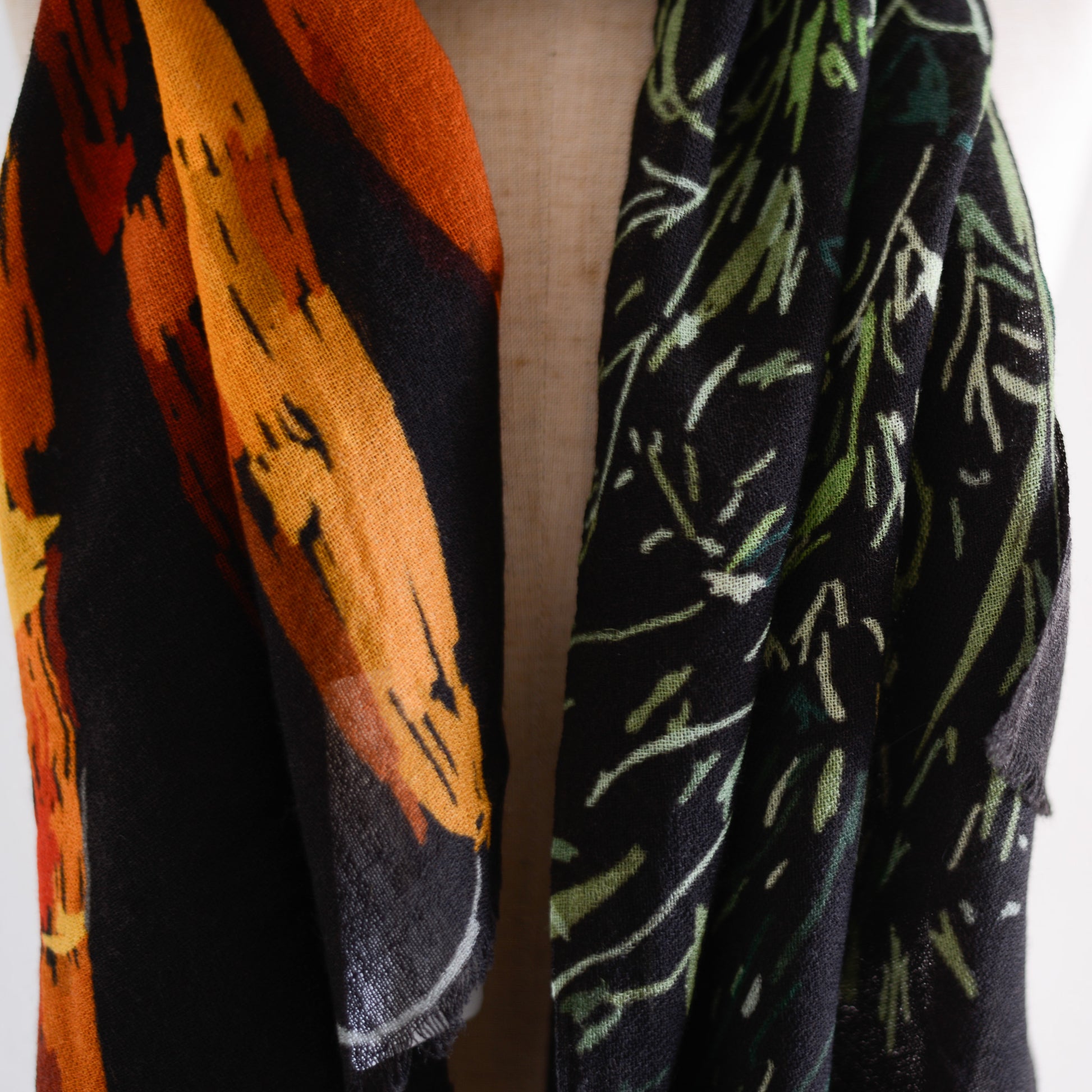 肩に掛ければ、ショールとして絵画のような存在感を放ち、首に巻けば、色のレイヤーが立体的に重なって美しいハーモニーが生まれます。