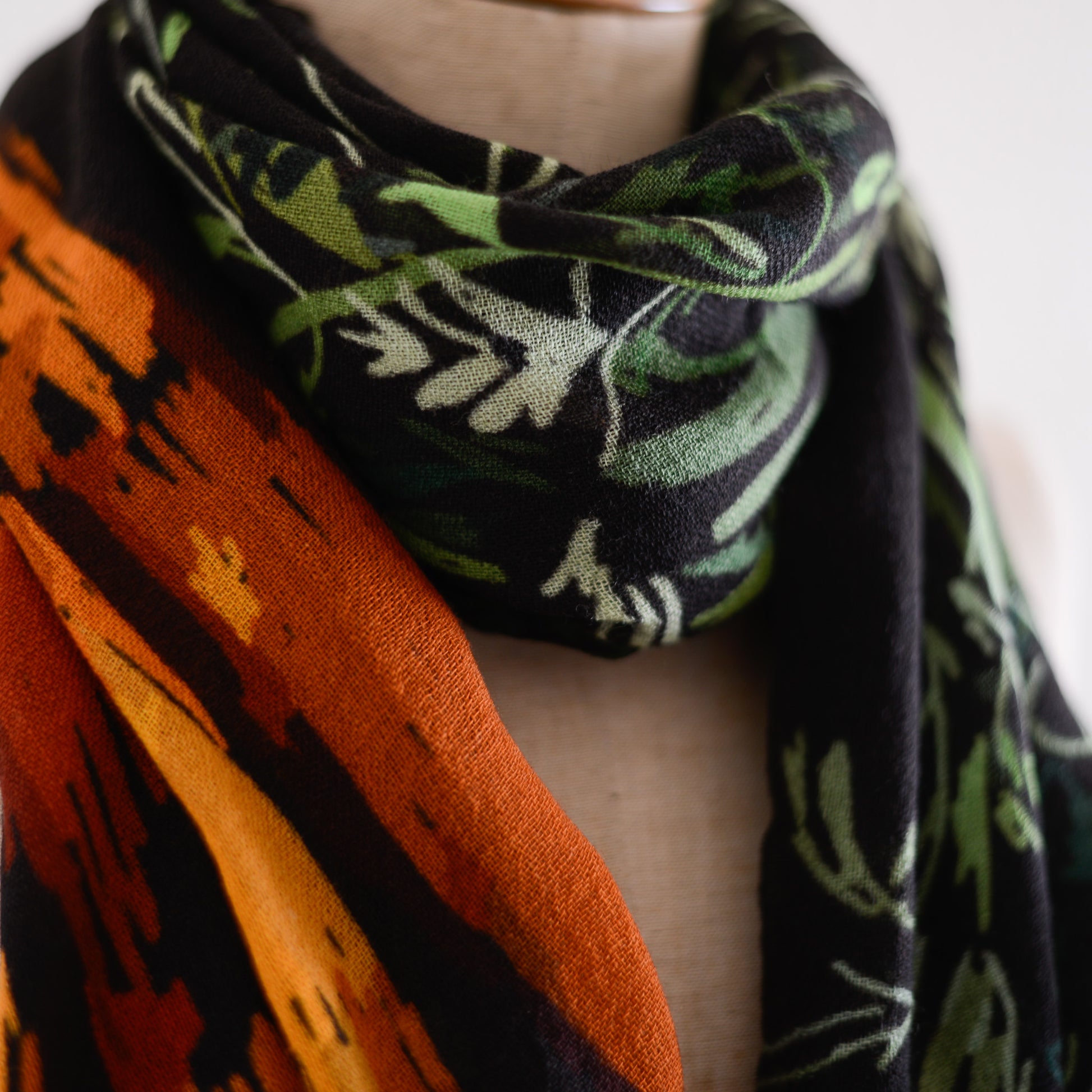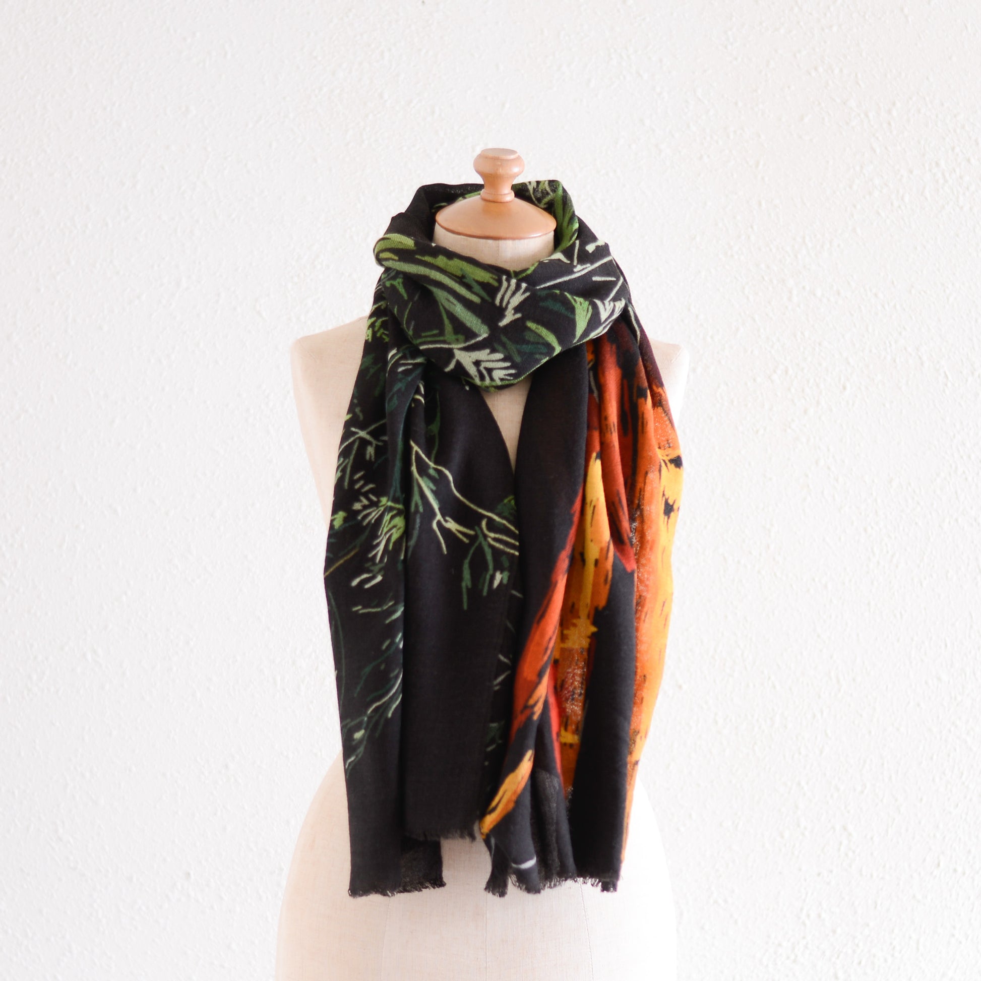 デフォルメされた野菜たちを大胆に描いた柄は、まるでアートピースのように色が響き合い、巻いた瞬間に表情が変わるのが魅力です。