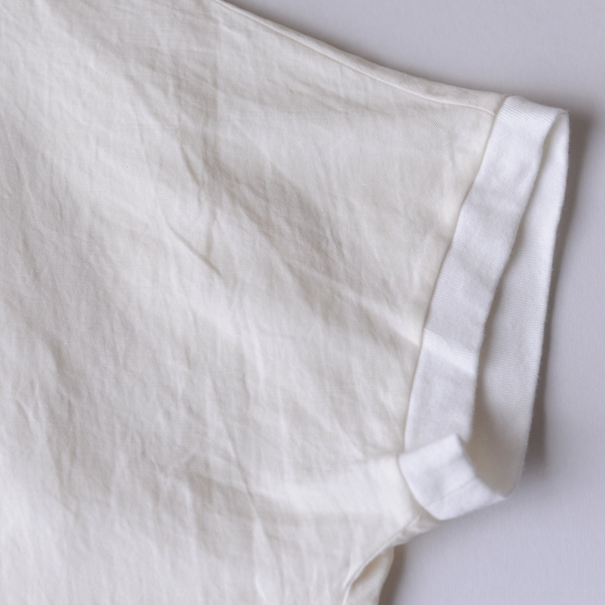 縦糸と横糸を丁寧に織り上げた生地ならではさらりとした手触りとほんのりとしたハリ感が特徴で、Tシャツでありながら上品な表情をつくります。