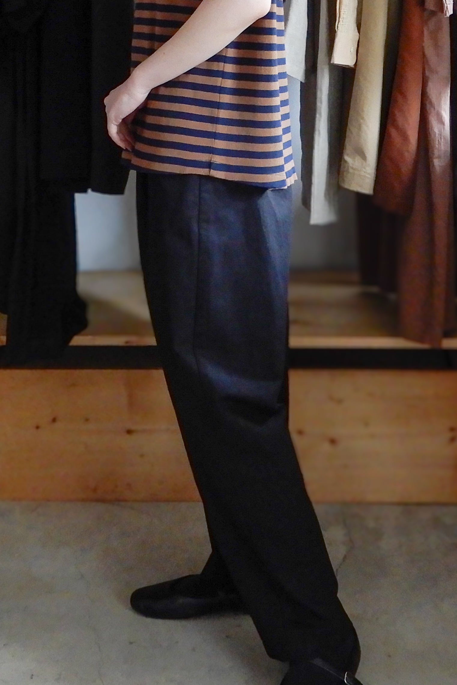 裾に向かってゆるやかに細くなるテーパードラインは、脚をまっすぐきれいに見せながら、動きやすさもきちんと確保した絶妙なバランス。