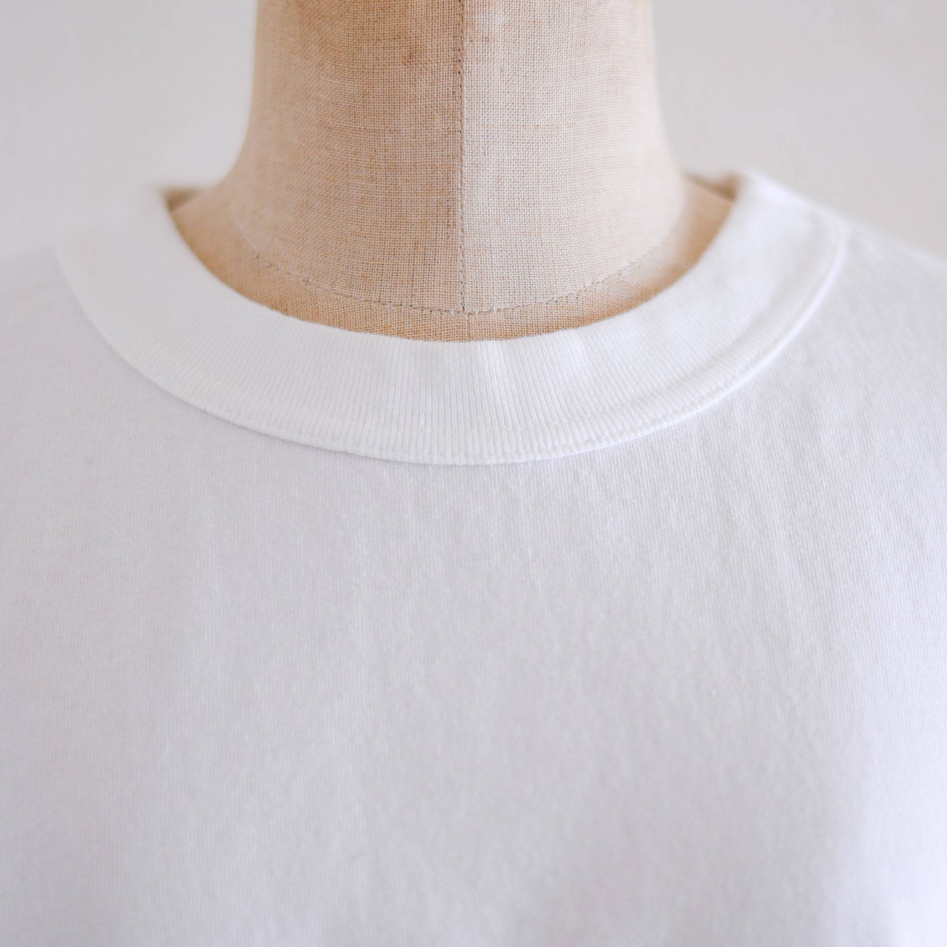 丸首のリブは幅広のバインダー仕上げで、顔まわりをすっきり見せつつ、Tシャツ全体の印象をキュッと引き締めてくれます。