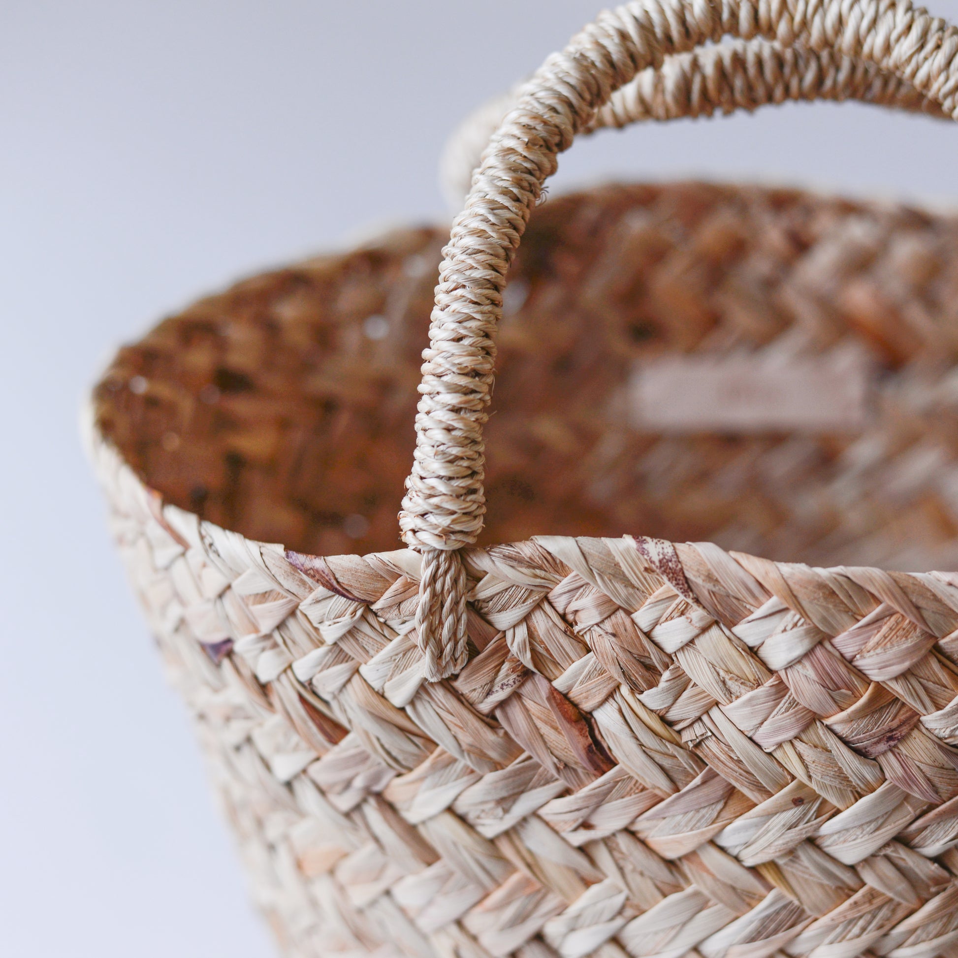 バッグは、フィリピン原産のバショウ科植物から採れる天然繊維、アバカ(ハンドル)とルピス(本体)を使って編み上げています。