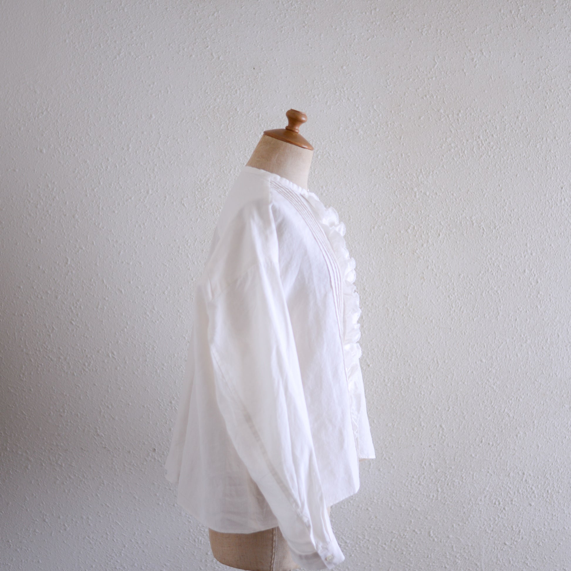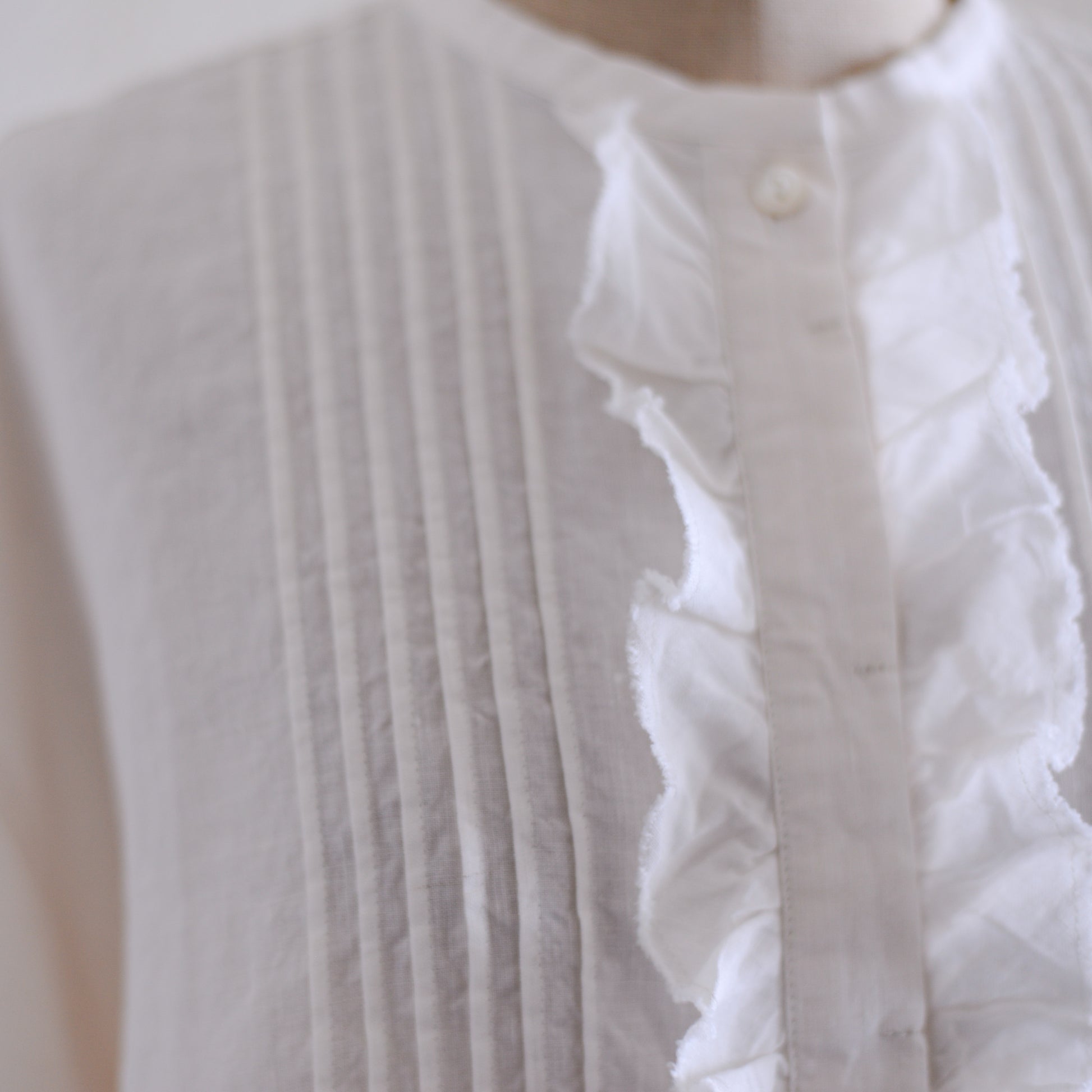 前身頃の中央には、立体的なフリルとタックを丁寧に重ね、甘くなりすぎず表情のあるデザインに仕上げています。